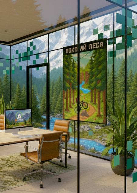 Обложка: /image prompt: show closer interior of the modern and fashionable spacious glass building in a style of pixel art for the brand featuring extreme sports in the mountains, forests and rivers.