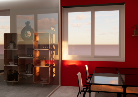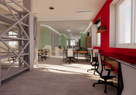 МАСТЕРСКАЯ. Цветовая гамма: · Белые стеллажи — чистота, открытость. Красный — это мощный импульс, он повышает энергию и физическую активность, что важно в мастерской. Будет включать в себя: · Небольшая техническая зона, где присутствует необходимая оргтехника · Стеллажи с нужными инструментами, место для хранения · Два средних стола на 4 человека и отдельные рабочие места Также стеклянные перегородки для ощущения более открытого и свободного пространства