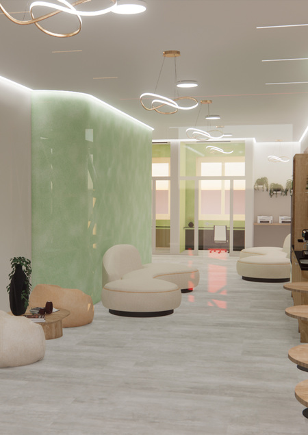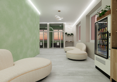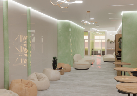 ОБЩЕЕ ПРОСТРАНСТВО / ЗОНА ОТДЫХА. · Цветовая гамма: Теплые оттенки, бежевый, карамельные тона, светло-зеленый. В совокупности это создает ощущение комфорта и уюта, способсвует расслаблению. Зеленый — цвет баланса и гармонии. Он идеально подходит для зоны отдыха, так как снимает стресс и усталость. · Социальные зоны: Высокие столы для быстрого кофе и низкие мягкие кресла-мешки для отдыха, также уютные столики возле окна с кофепоинтом. · Плавные, обтекаемые формы мебели.