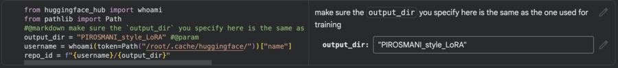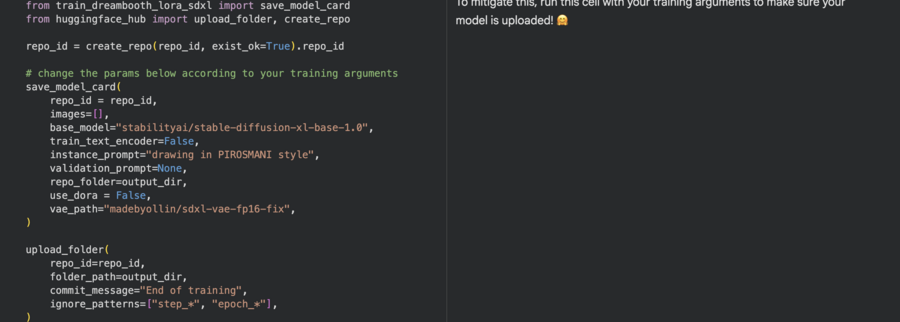 Процесс обучения модели был настроен с указанием выходной директории для сохранения результатов. После завершения обучения итоговая модель была загружена в репозиторий Хаб и применена для генерации изображений.