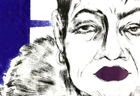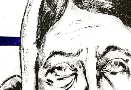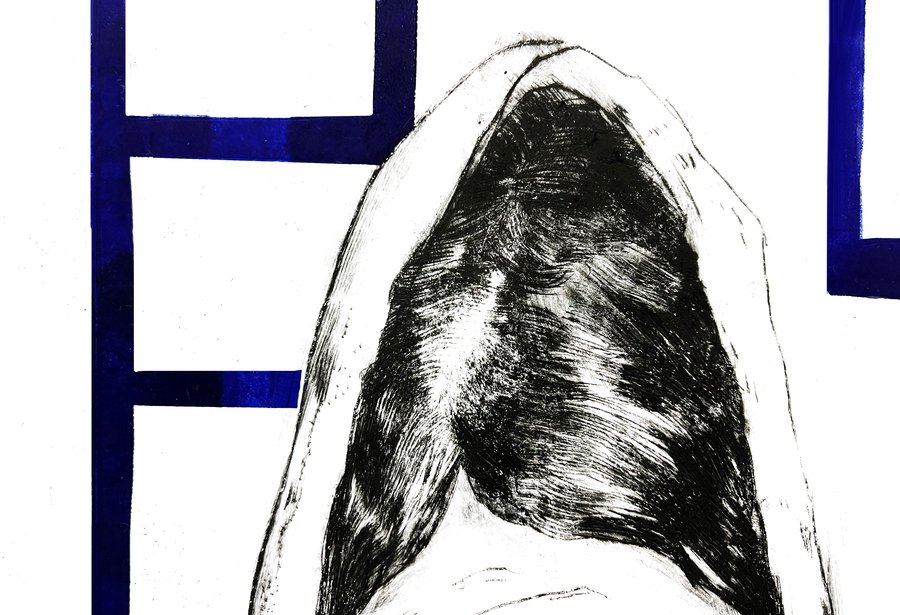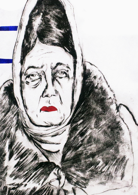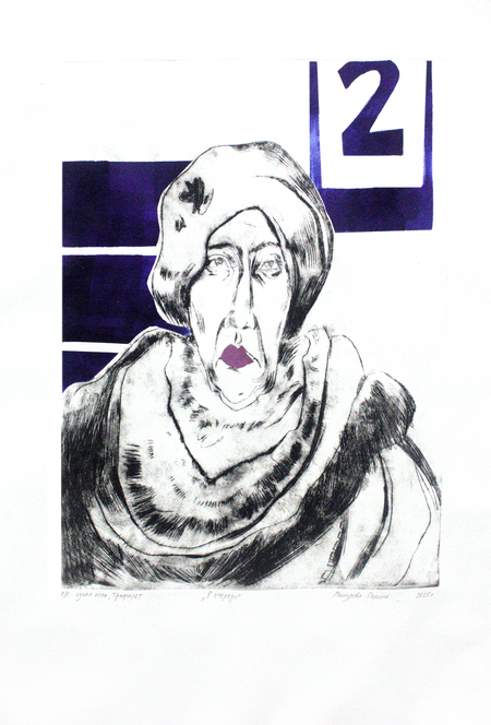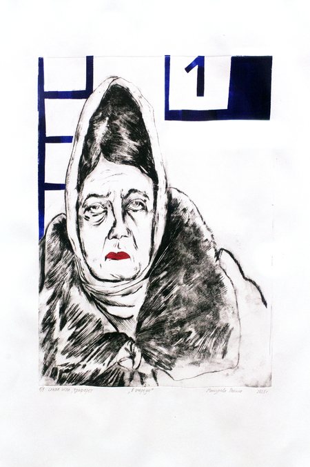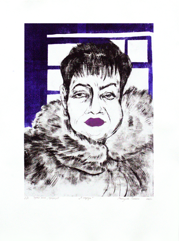 Моя серия печатной графики состоит из четырех портретов бабушек, в лица которых я обычно упираюсь взглядом в очереди на почте или в мфц. У них большие меховые капюшоны, чуть отодвинутый от шеи шарф, напряженные лбы, яркая расплывающаяся помада и очень недовольные, уставшие лица.