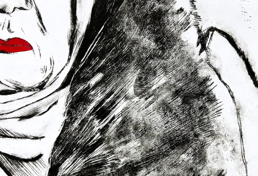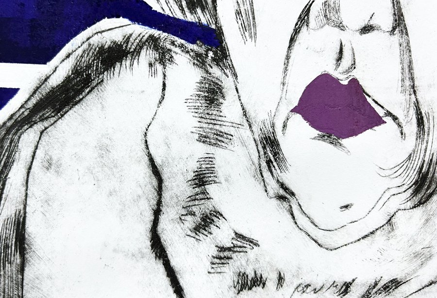 Работа выполнена в технике сухая игла и дополнена цветным трафаретом.