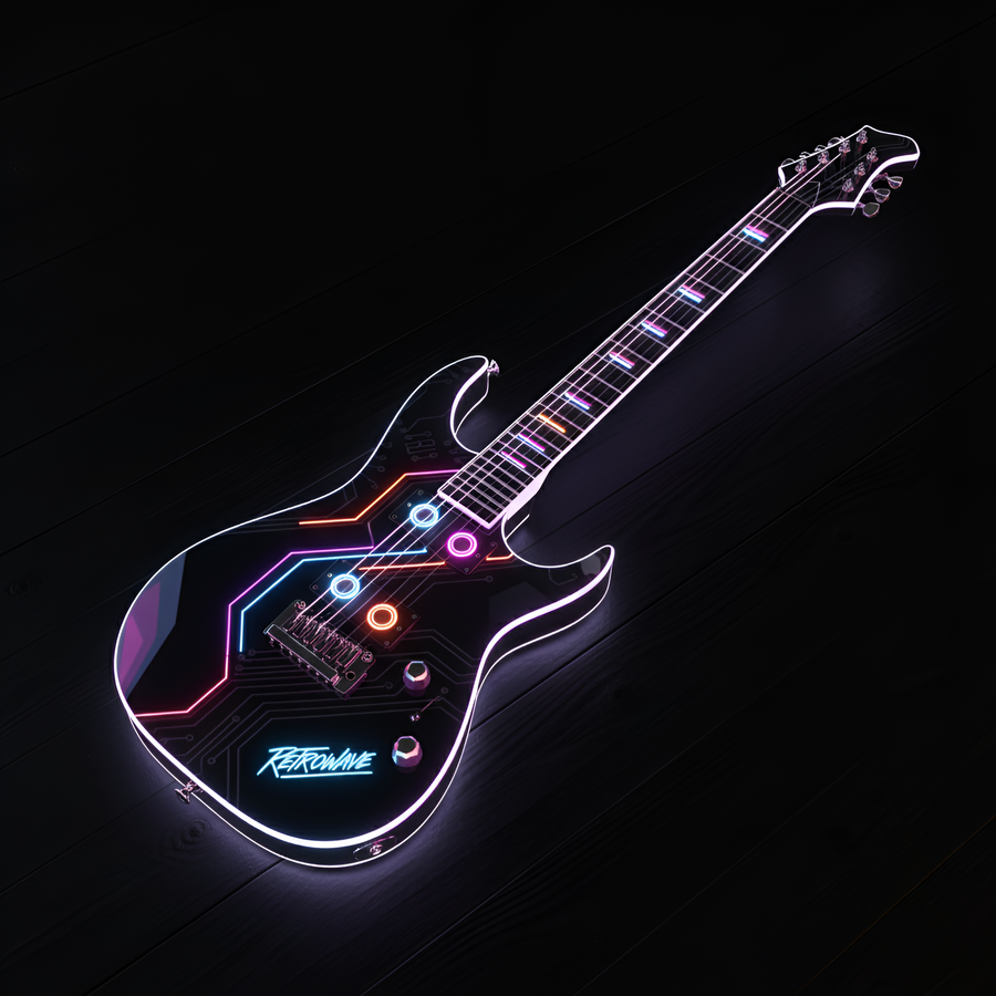 Промпт: an electro guitar, mockup, photorealistic, neon colors, retrowave elements, black background