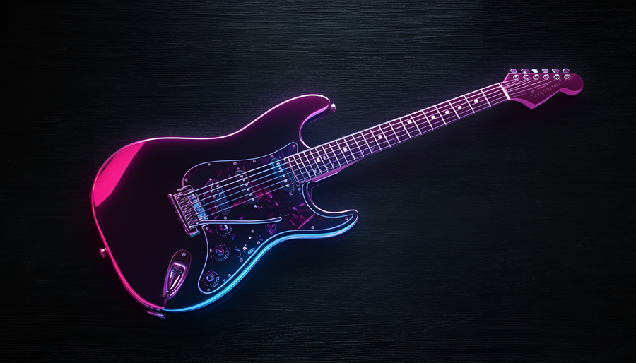 Промпт: a guitar pick glowing with vibrant pink and blue neon light, modern design, textured background, professional studio shot
