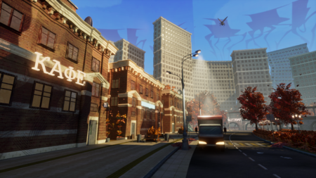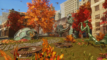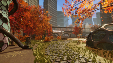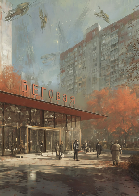Промт: Futuristic Moscow autumn park with giant insect sculptures, Soviet modernist architecture in background, vibrant red and orange maple trees, flying bio-mechanical insects in blue sky, pedestrian zone with «БЕГОВАЯ» signage, photorealistic cinematic lighting, afternoon golden hour