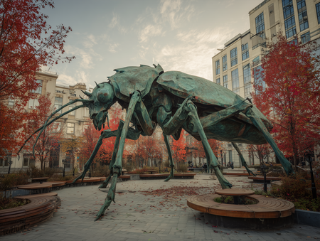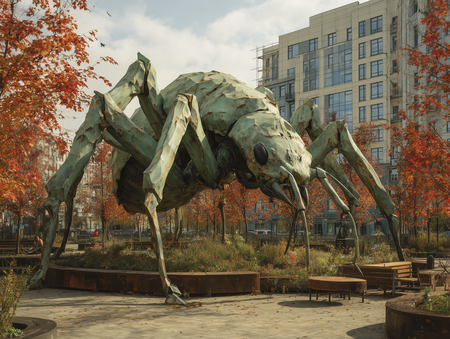 Промт: Monumental green insect sculpture installation in urban park, bio-composite material with hexagonal patterns, 15-meter tall beetle/spider hybrid, realistic anatomical details, autumn foliage, modern Moscow architecture background, epic scale, wide-angle photography