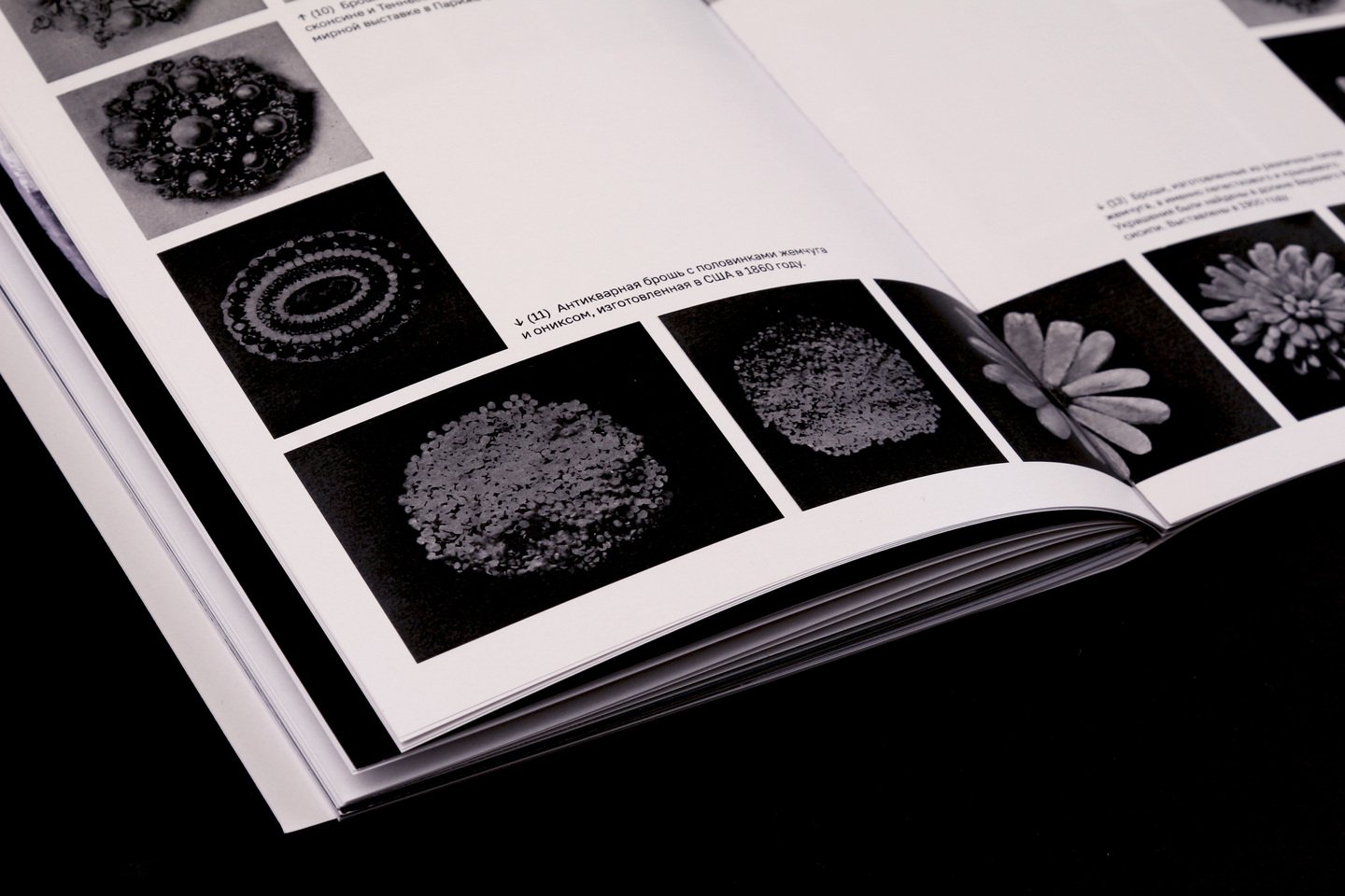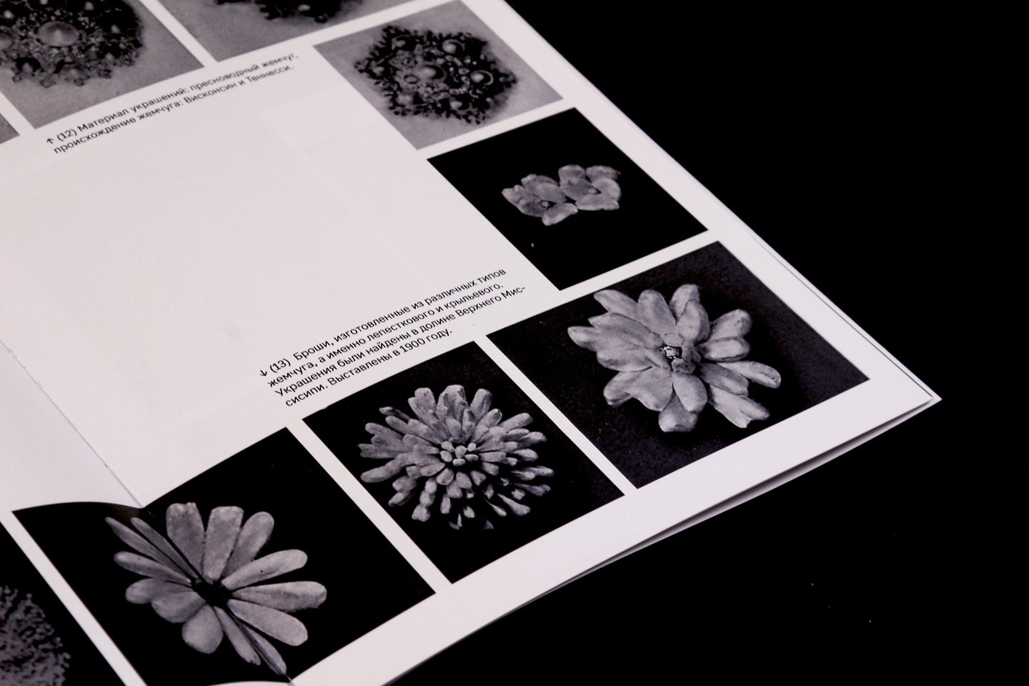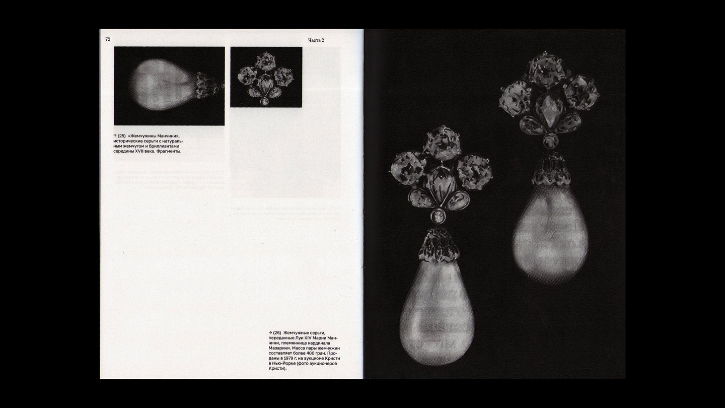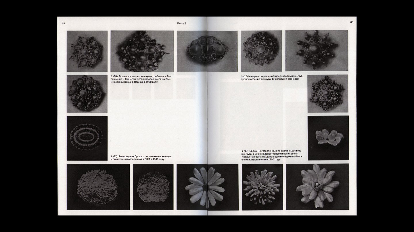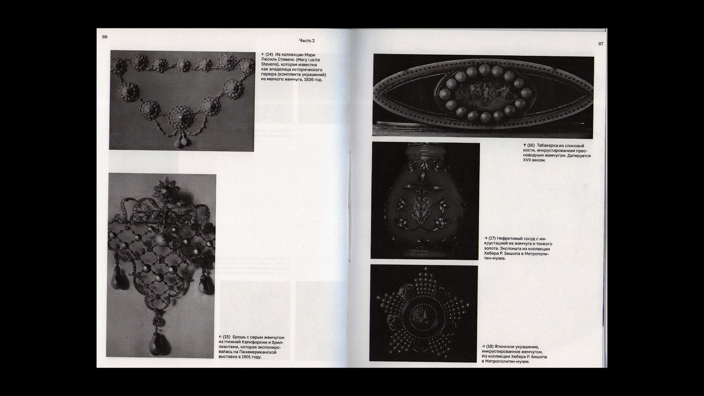 На внешней стороне коротких разворотов расположены подписи и архивные снимки жемчужных украшений.