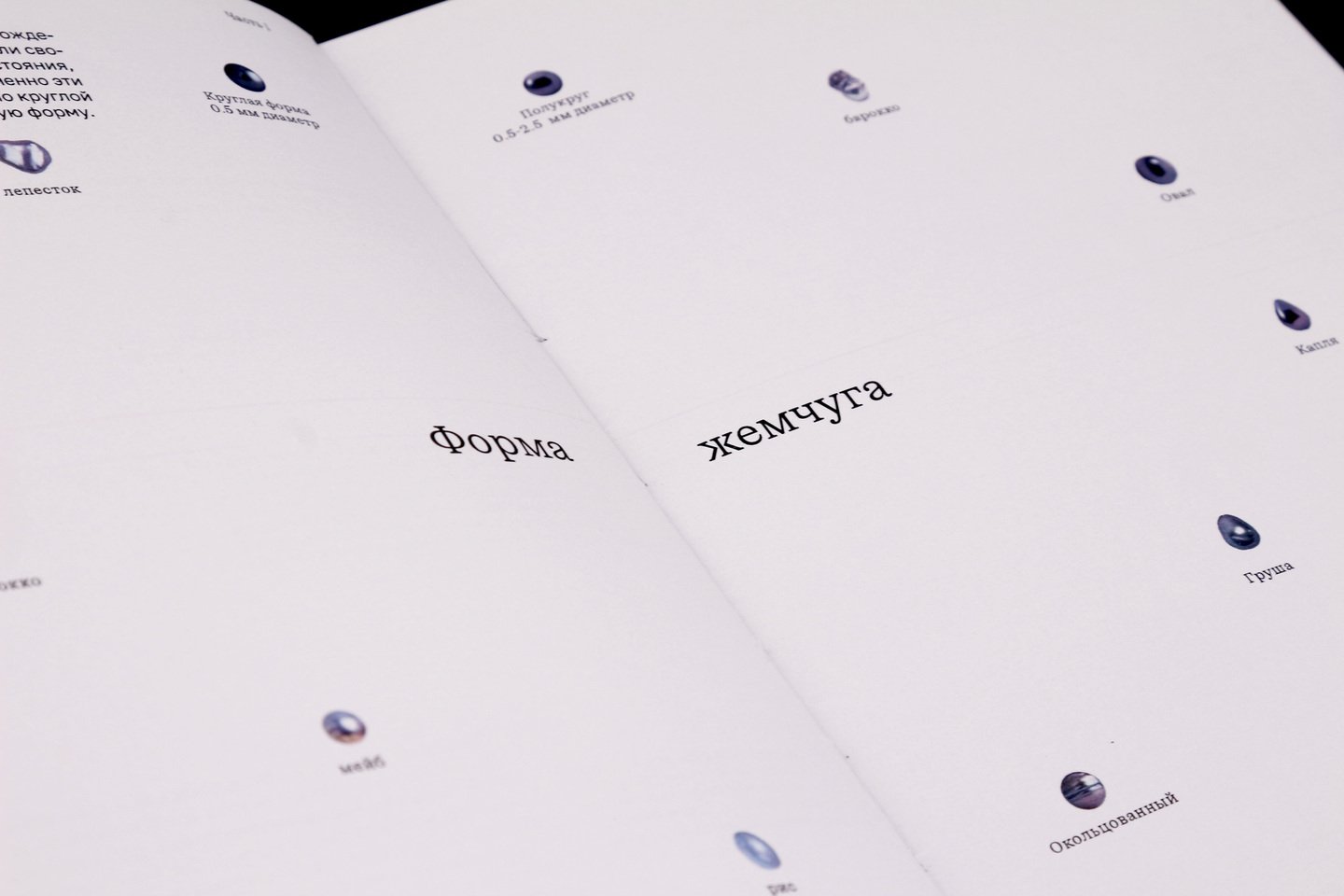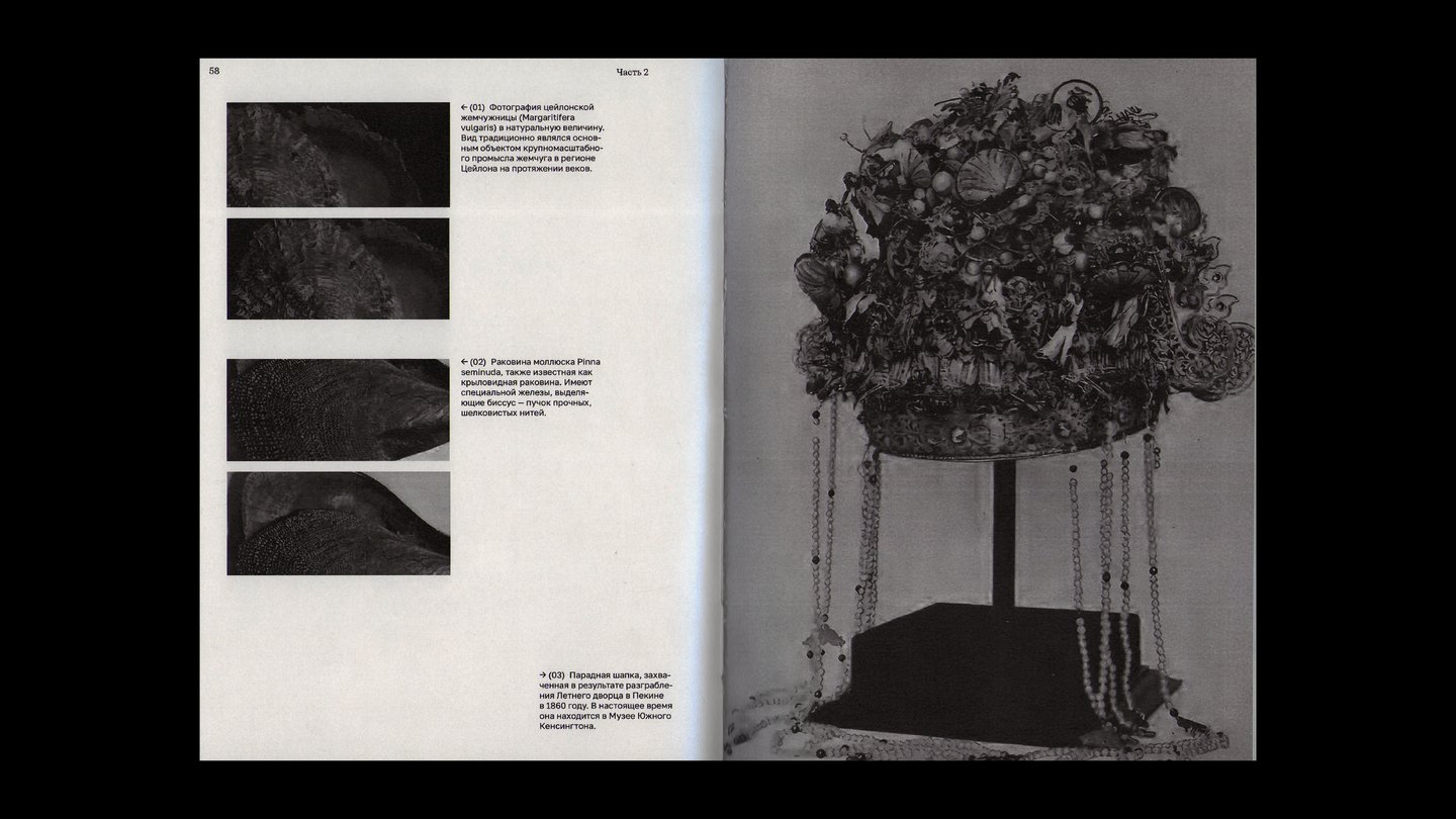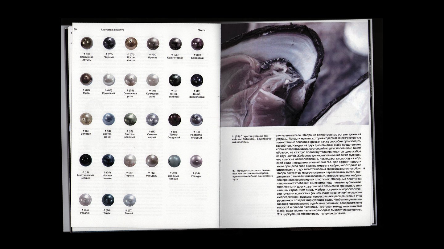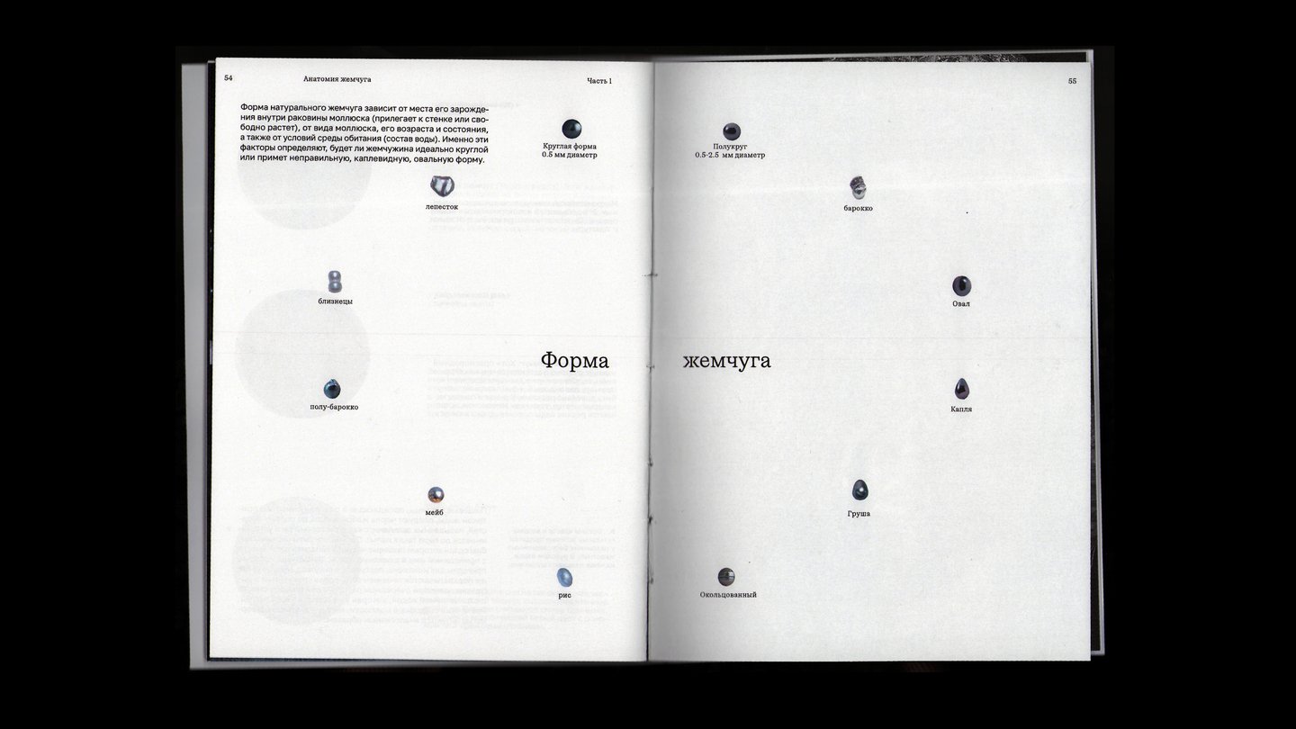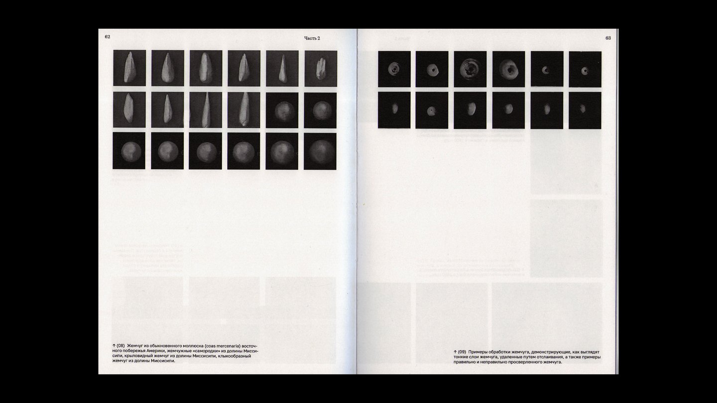 На внешней стороне коротких разворотов расположены подписи и архивные снимки жемчужных украшений.