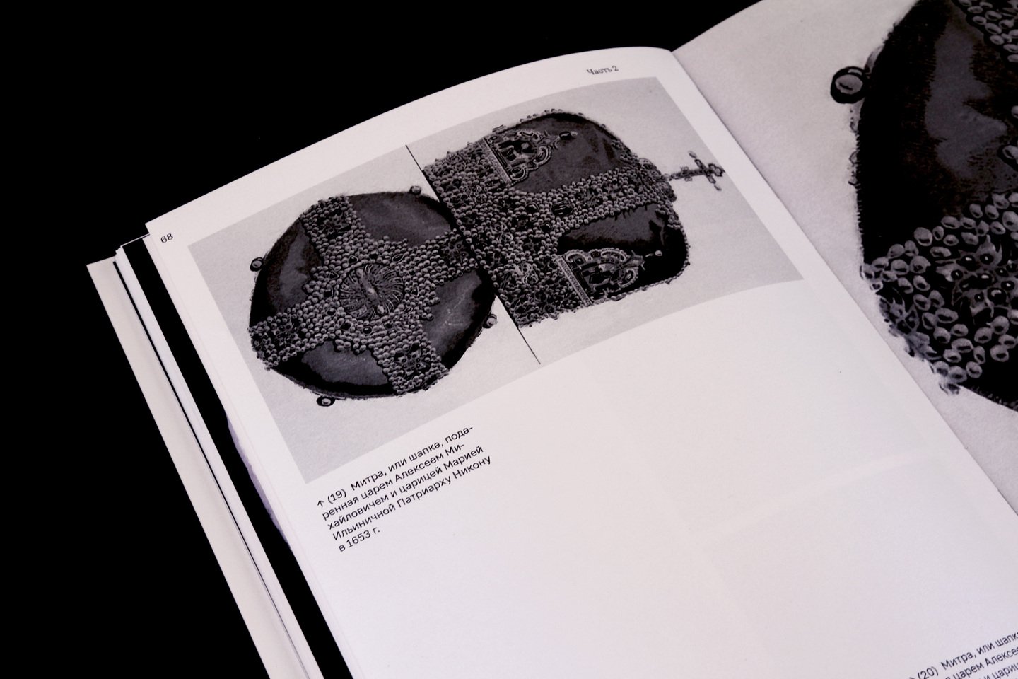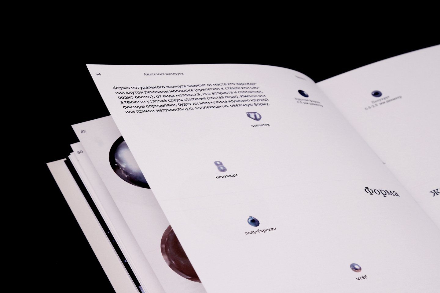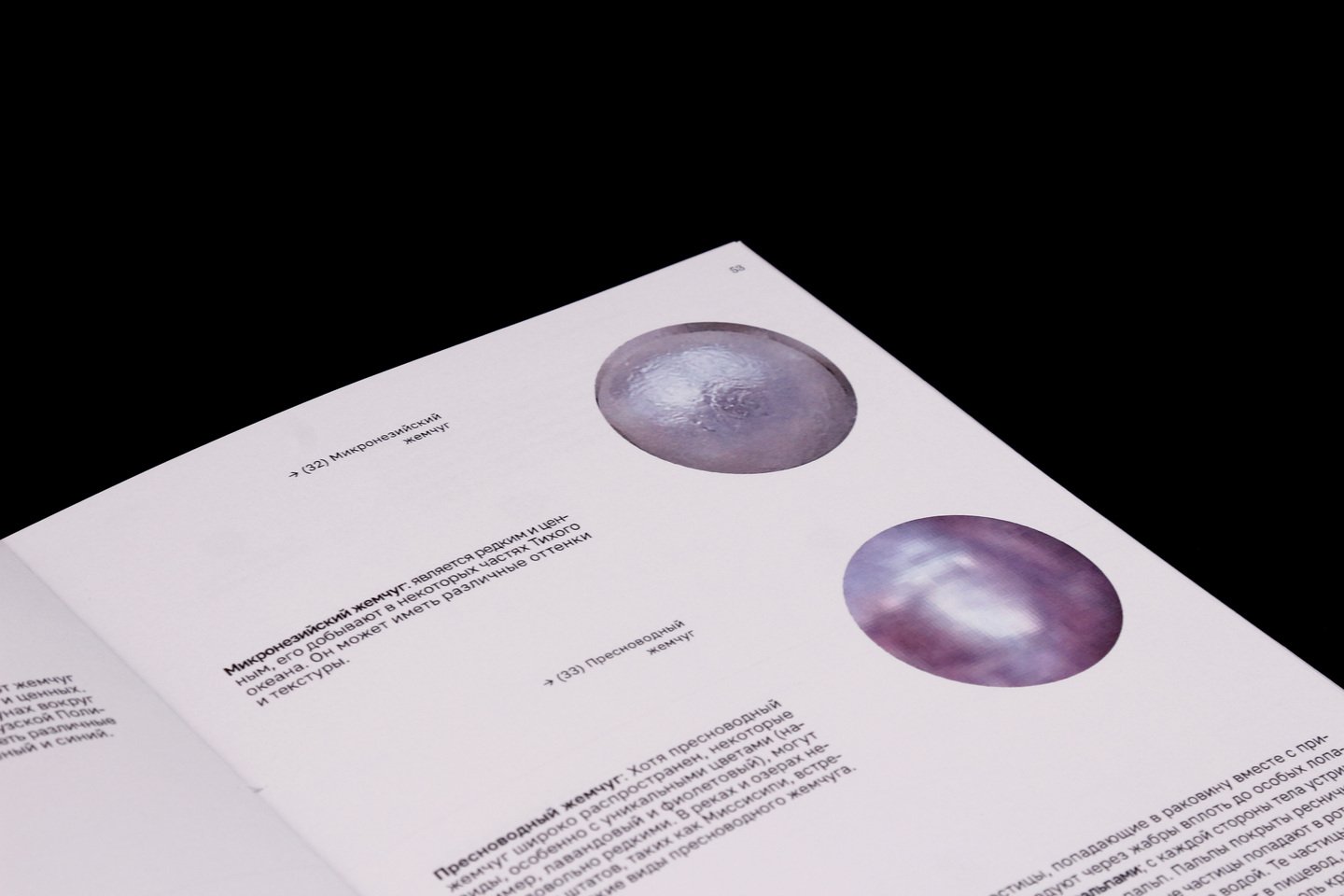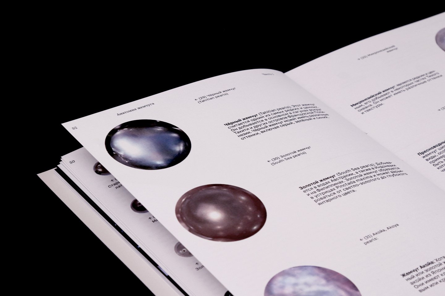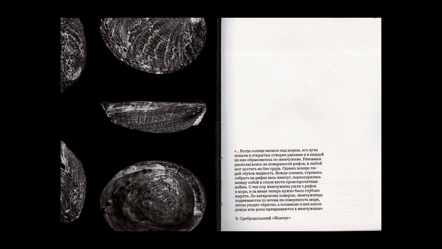 На внешней стороне коротких разворотов расположены подписи и архивные снимки жемчужных украшений.