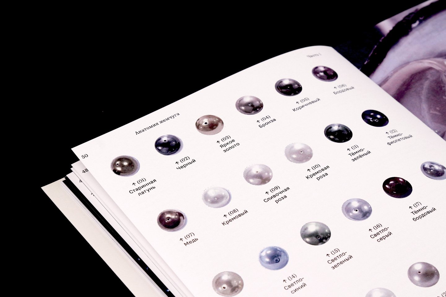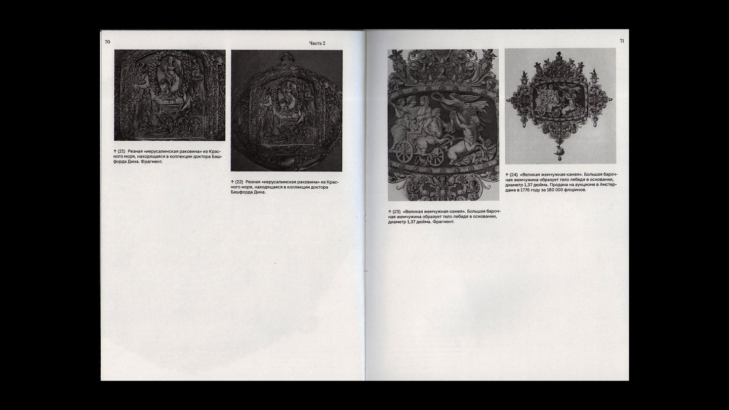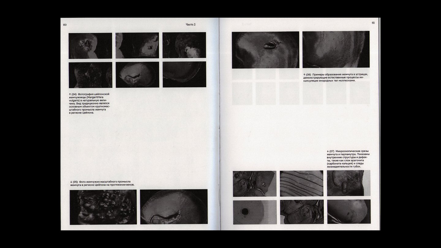Последняя часть книги — каталог, выполненный на жемчужной бумаге. В нём собраны архивные снимки драгоценностей из частных коллекций с использованием натурального жемчуга, а также снимки под микроскопом.