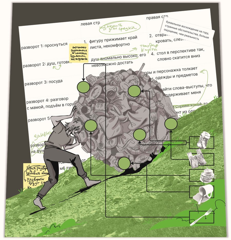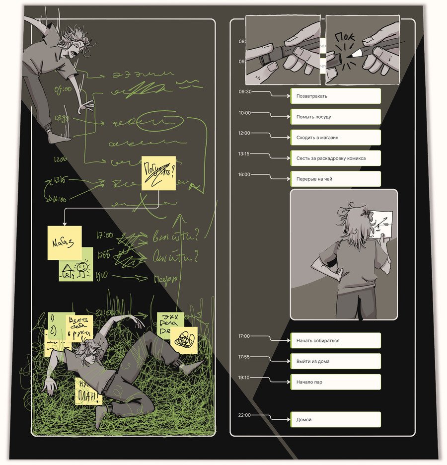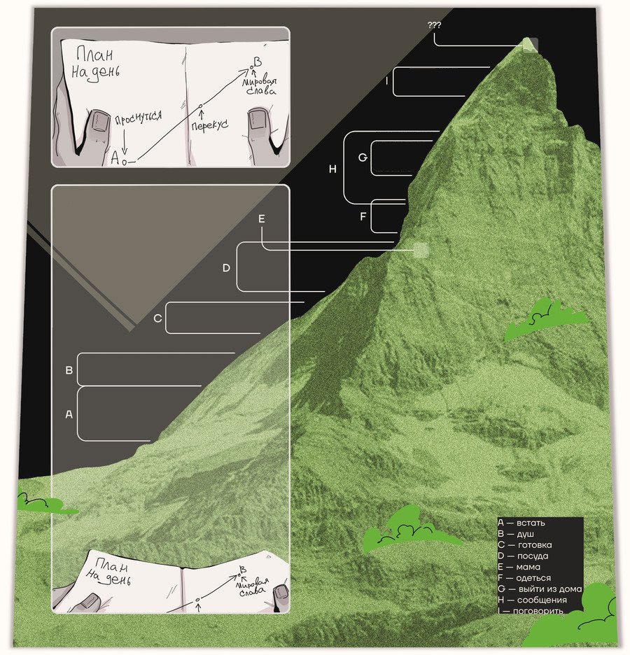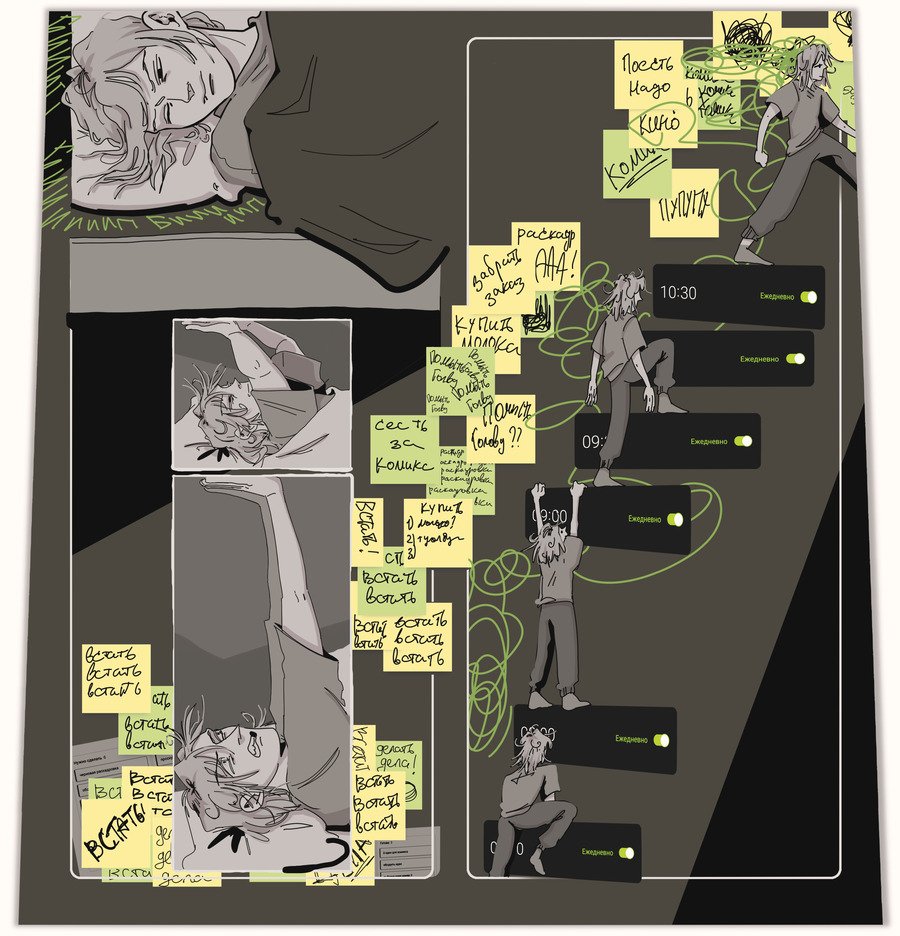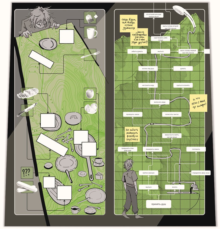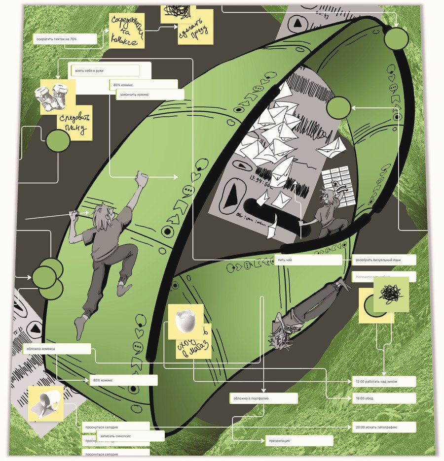 Этот проект исследует планирование не как скучную рутину, а как стратегию выживания. Главная метафора — восхождение по горе из бытовых задач и навязчивых мыслей. Часть работы была создана непосредственно в интерактивной доске Holst, которую я использую для планирования личных задач